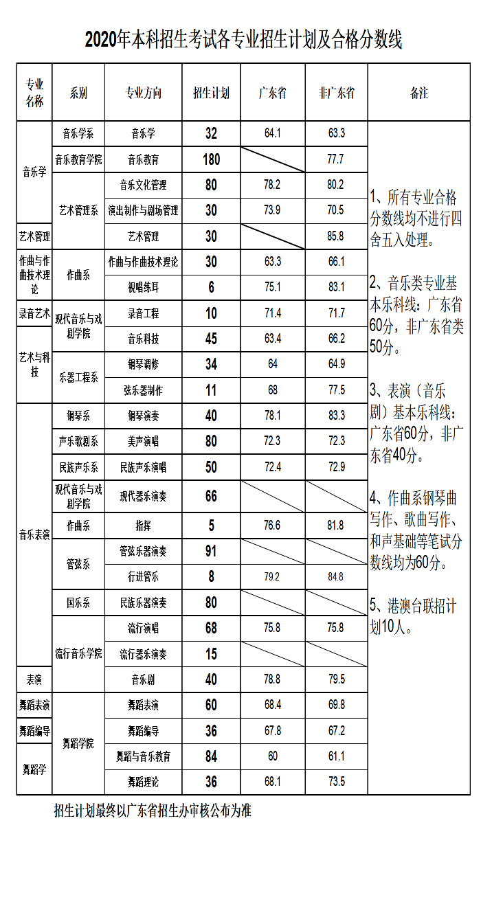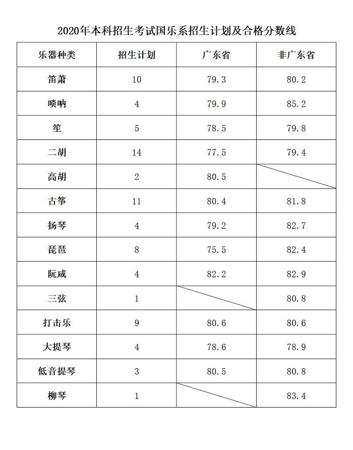 2020年星海音乐学校本科招生考试各专业招生计划及合格分数线