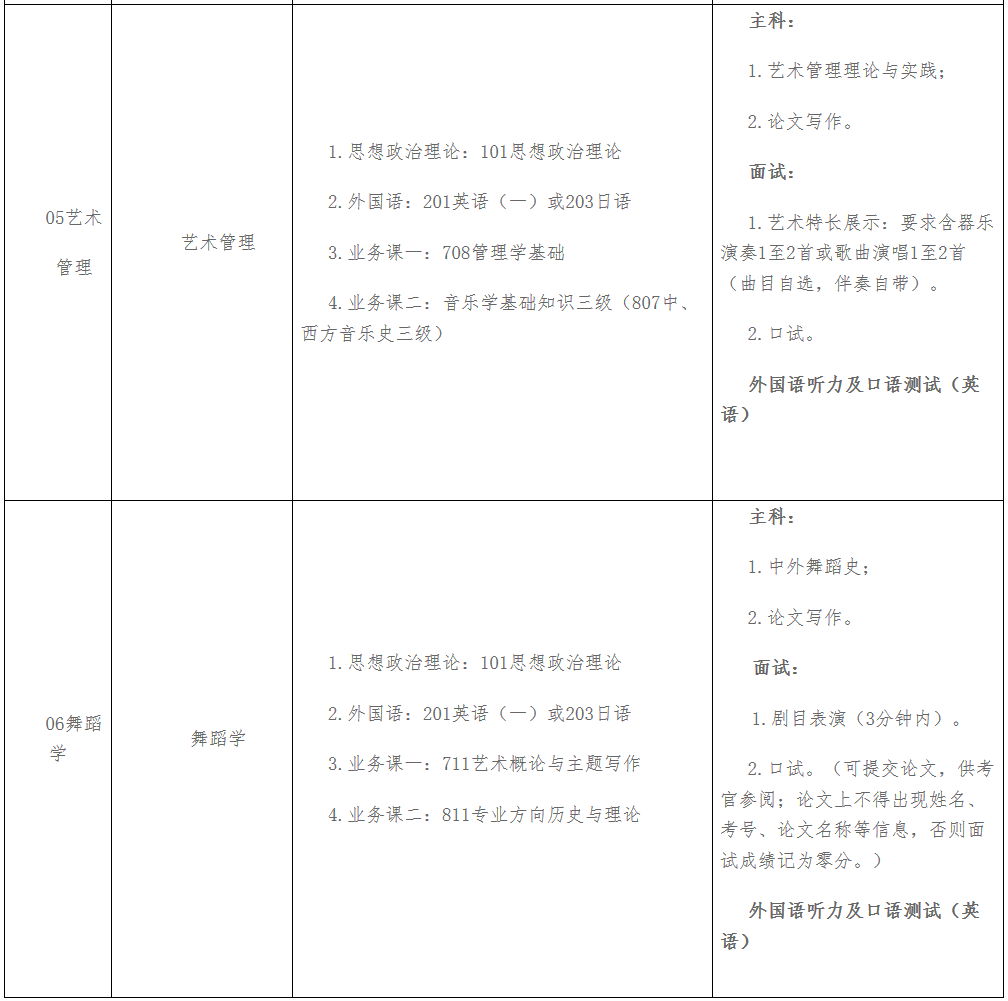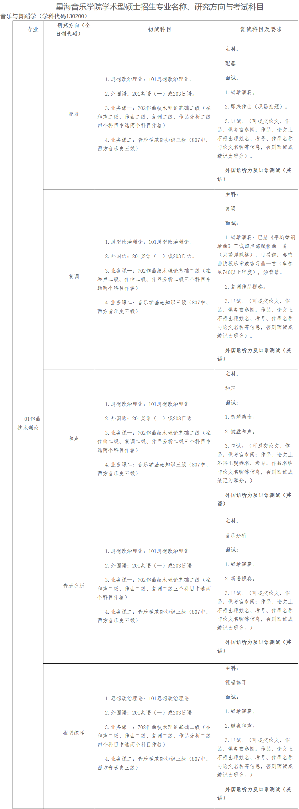 注:1.初试科目中的和声、作品分析、中国音乐史、西方音乐史等专业基础课程,其考试内容按不同专业方向的难易程度分级确定考试标准。