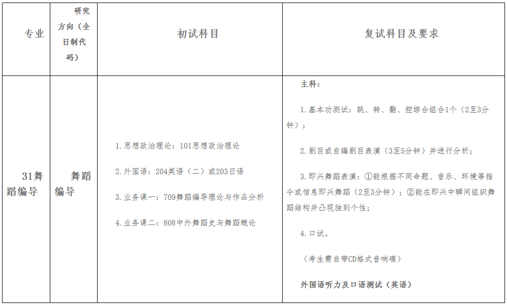 3.加试科目:同等学力报考者、成人高校应届本科毕业生、自学考试和网络教育本科毕业生、非音乐类专业考生,在复试期间需加试视唱练耳(含听写、视唱两部分)与器乐演奏(自备练习曲、乐曲各一首,需背谱独奏,不带伴奏);舞蹈编导专业需加试舞蹈编导基础理论与中国民族民间舞技能测试。
