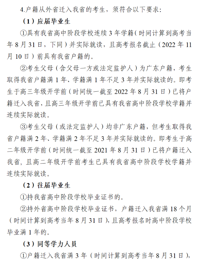 ①具有我省高中阶段学校连续3年学籍(时间计算到高考当 年8月31日,下同)并实际就读,且高考报名截止(2022年11 月10曰)前具有我省户籍的。