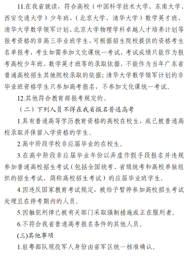 11. 在我省就读,符合高校(中国科学技术大学、东南大学、 西安交通大学)少年班、(北京大学、清华大学)数学英才班、 清华大学数学领军计划、北京大学物理学科卓越人才培养计划等 报考资格的非高三毕业班学生,可根据招生院校提供的资格考生 名单报考,考生如需参加文化课统一考试,考试成绩只能作为报 考高校少年班、数学英才班等的录取依据,不能作为当年广东省 普通高校招生其他院校录取的依据;清华大学数学领军计划的非 毕业班资格学生只参加高考报名,不参加文化课统一考试。