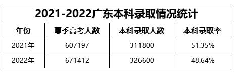 此外,据广东省教育考试院公布的录取数据可知,2022年广东省参加夏季高考共有67.14万人,本科录取人数为326600,本科录取率为48.64%。这还不包含春季高考,很多人是考完春季高考不参加夏季高考的考试的。