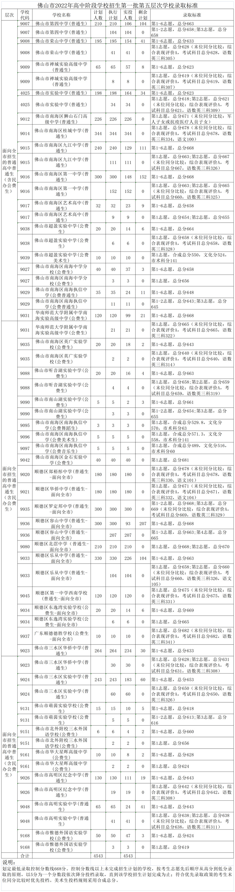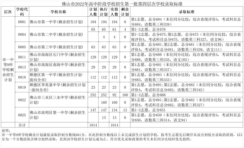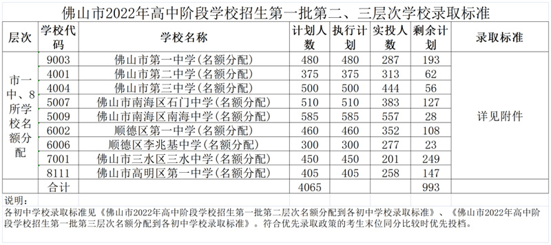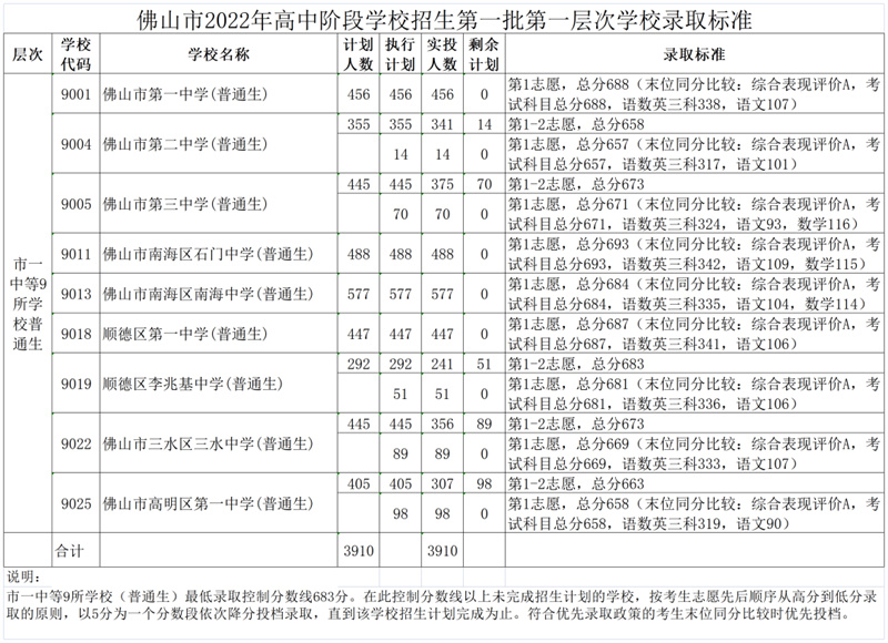 2022年佛山市高中阶段学校招生第一批录取控制分数线及学校录取标准如下。