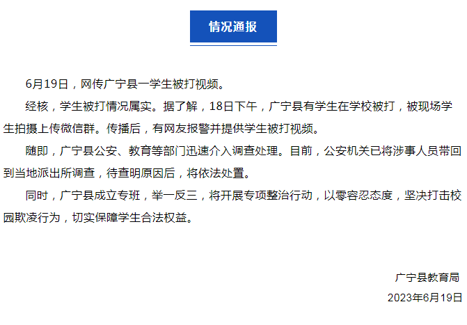 6月19日,网传“广东广宁一女学生在厕所遭校园暴力,被逼下跪磕头”引发网友关注。对此,广宁县教育局发布一则情况通报。