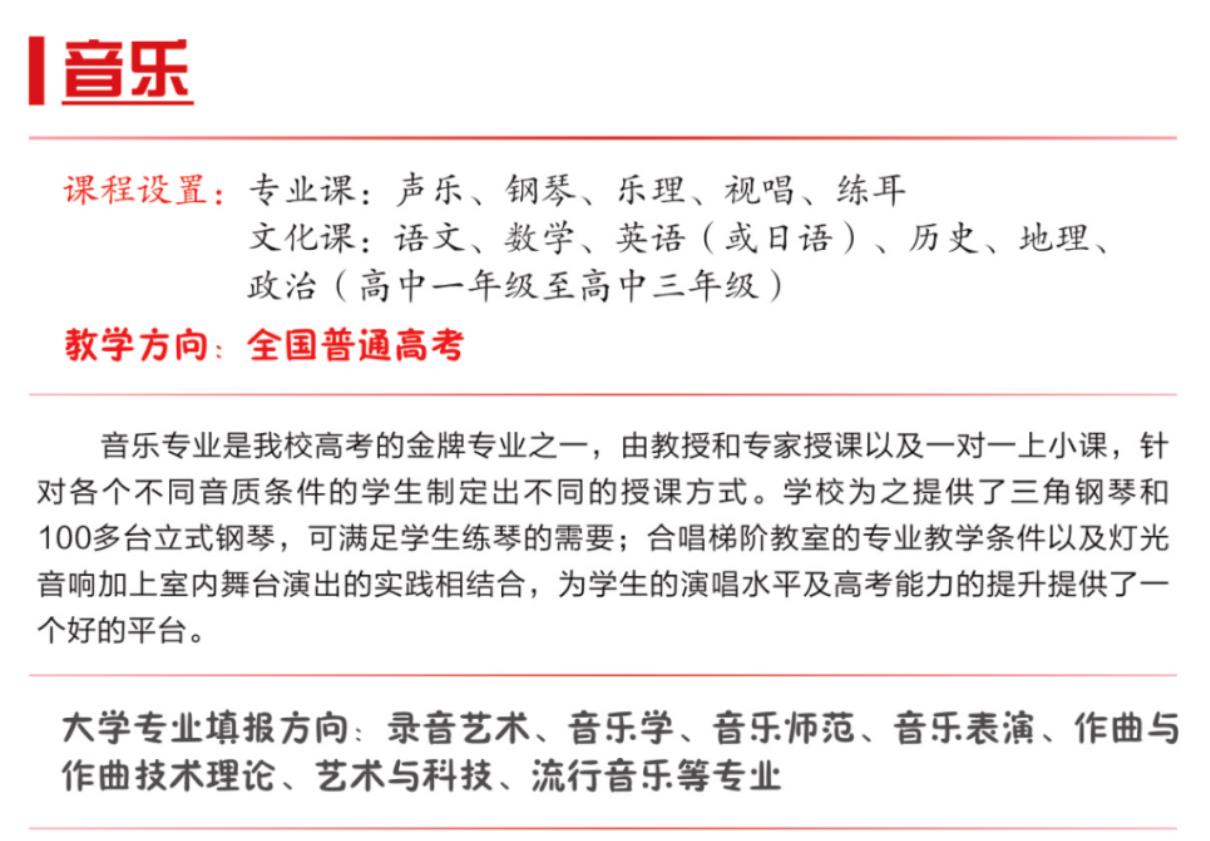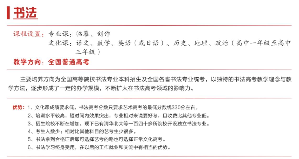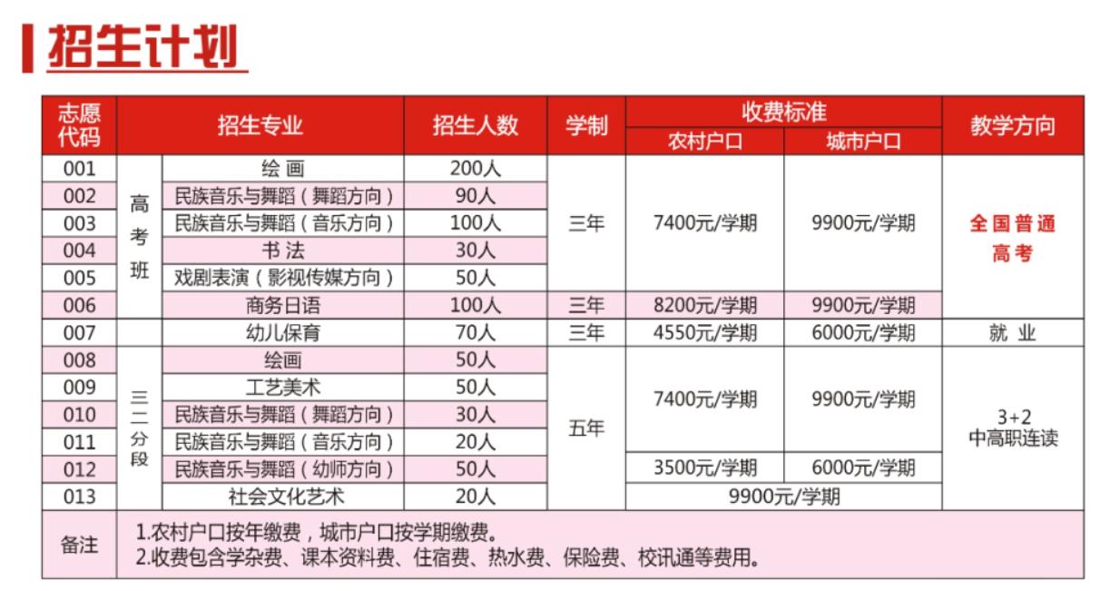 学校以“德艺双馨,服务社会”为办学宗旨,以培训高质量的艺术人才为目标,开设舞蹈高考班、音乐高考班、美术高考班、商务日语高考班、书法高考班、幼儿保育等专业,培养了大批艺术特长生考入全国各大知名院校,并多次在省市组织的比赛当中荣获一等奖。多年来输送了大量优秀的学生走向社会,得到了社会各界的肯定和赞誉