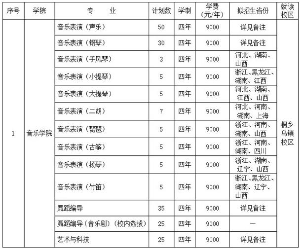 注:1.音乐表演(声乐)专业拟面向浙江、安徽、福建、河北、河南、黑龙江、湖北、湖南、江苏、江西、辽宁、内蒙古、山西、上海、四川等15个省份招生,专业成绩承认相应省统考成绩。