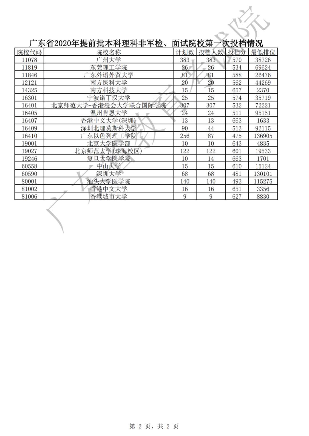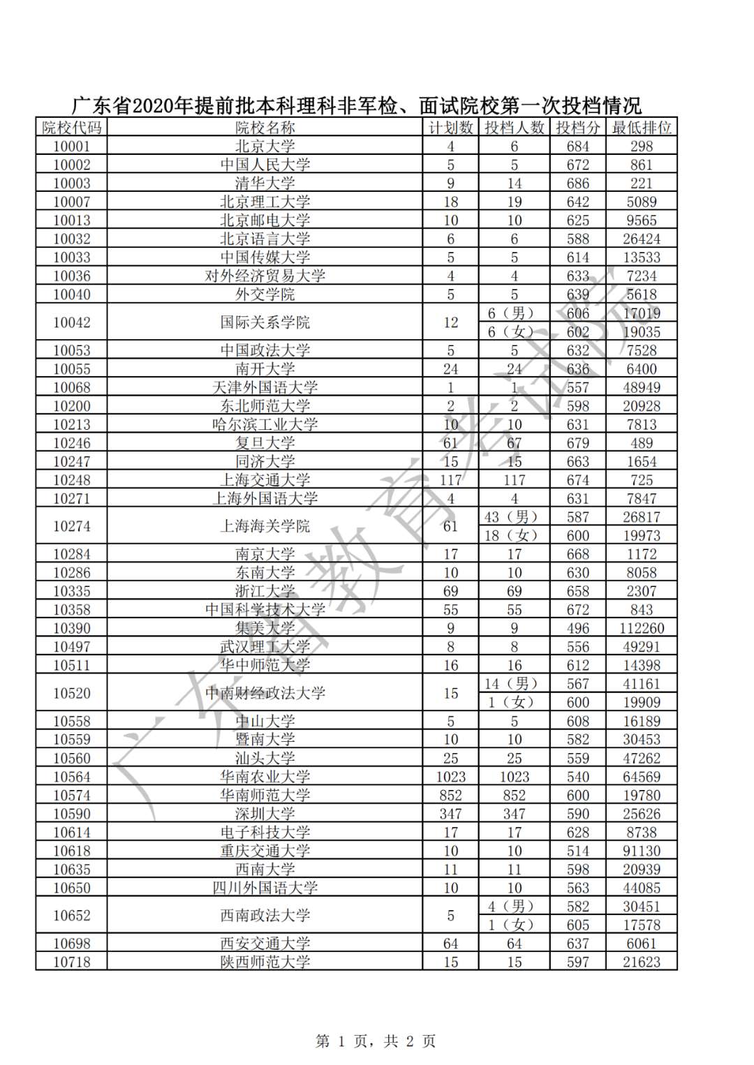 从投档情况看,今年非军检院校依然实行平行志愿投档,考生可以填报6个院校志愿,志愿填报情况总体上更趋均衡,生源情况良好,除广东以色列理工学院、深圳北理莫斯科大学理科类中外合作办学专业因为有单科成绩要求未满档外,其他院校第一次投档均满档。从投档分数看,除个别院校中外合作办学和个别特殊性专业投档分数线相对较低外,其他院校投档分数线都在高分优先投档线以上,其中,大部分院校投档分数线远超高分优先投档线,特别是知名高水平大学依然受到考生“追捧”。如北京大学文、理科投档线分别为642分、684分;清华大学理科投档线为686分;复旦大学文、理科投档线分别为633分、679分。从省内高校情况看,往年的“热门”院校,今年热度不减,投档线普遍较高。如香港中文大学(深圳)文、理科投档线分别为618分、663分;南方科技大学理科投档线为657分。从院校专业生源情况看,招收小语种和试验班的高校生源“火爆”,特别是个别“偏门”外语小语种和基础学科试验班专业今年受到青睐,投档分居高不下。从投档后高校初步专业分档情况看,部分高校虽一次投满档,但由于考生专业志愿不平衡,有些考生填报专业不服从,将被高校退档。对退档后造成的专业缺额计划,省招生办将组织征集志愿。
