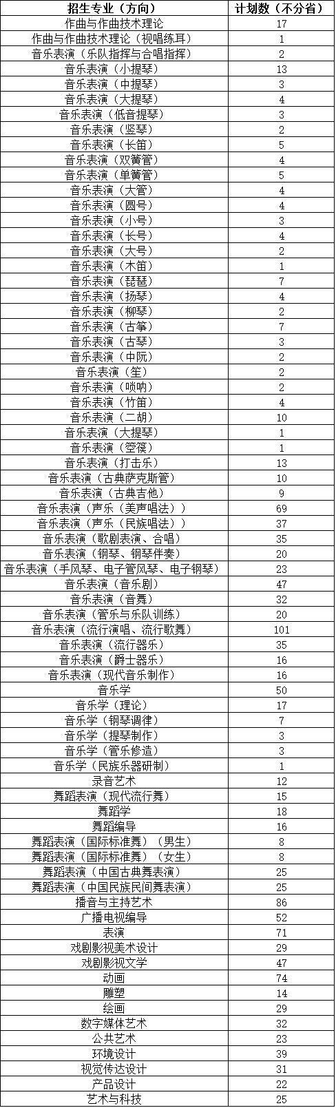 备注:取消专业校考的摄影、影视摄影与制作、艺术史论、艺术管理四个专业,认定省统考的广东省美术类专业、山东省编导类及美术类专业将编制分省计划,待教育主管部门审核下达后以各省级招生考试机构公布为准。