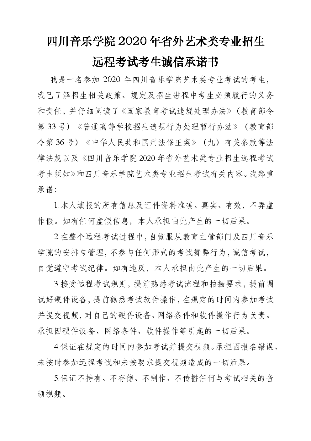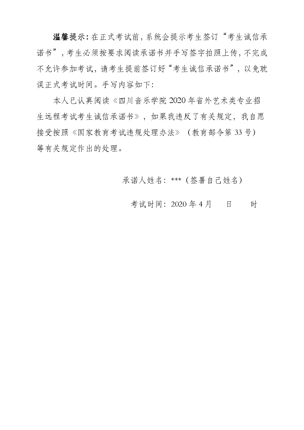本人已认真阅读《四川音乐学院2020年省外艺术类专业招生远程考试考生诚信承诺书》,如果我违反了有关规定,我自愿接受按照《国家教育考试违规处理办法》(教育部令第33号)等有关规定作出的处理。承诺人***(签署自己姓名)。