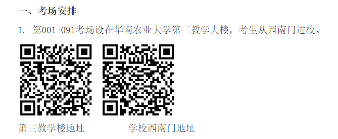 1. 第001-091考场设在华南农业大学第三教学大楼,考生从西南门进校。
