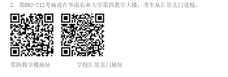 2. 第092-212考场设在华南农业大学第四教学大楼,考生从汇景北门进校。