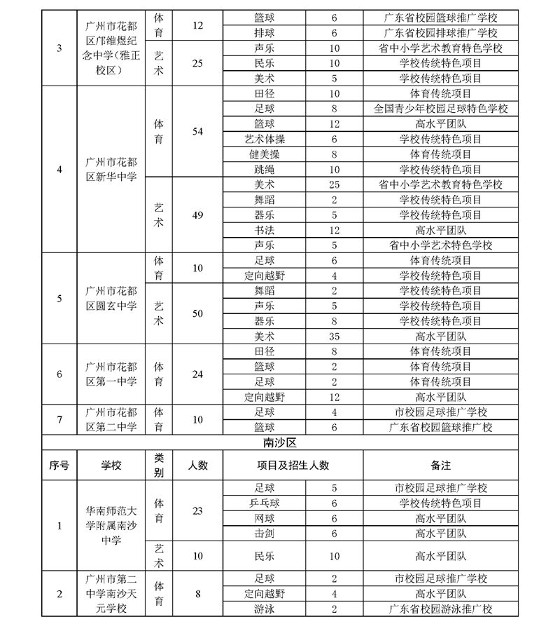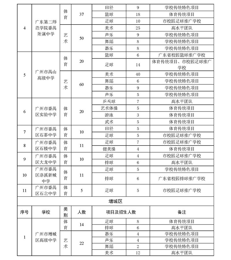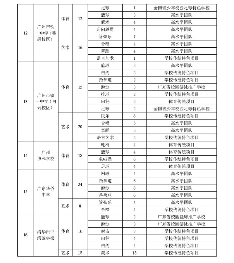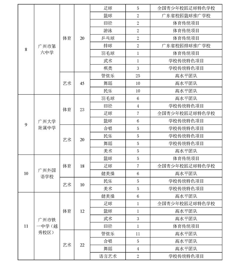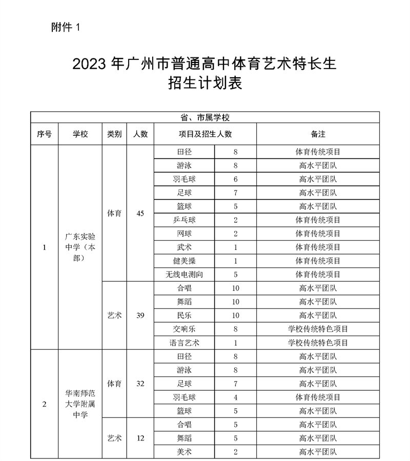 2023年广州市普通高中体育艺术特长生招生计划表