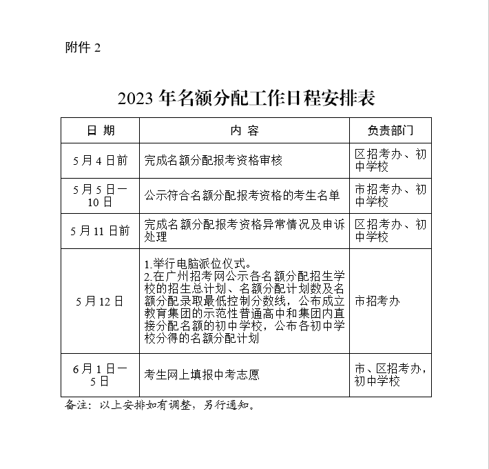 根据《广东省招生委员会办公室 广东省教育厅 广东省人力资源和社会保障厅关于印发〈广东省2023年高中阶段学校招生录取工作实施办法〉的通知》(粤招办〔2023〕3号)和《广州市教育局印发〈关于进一步深化高中阶段学校考试招生制度改革的实施意见〉的通知》(穗教规字〔2018〕8号,以下简称《实施意见》)精神,为做好2023年广州市普通高中名额分配招生工作,现将有关事项通知如下: