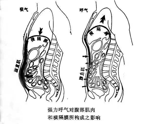 二是,着重体会,在这种呼吸肌的配合中、靠腹肌收缩往外送气流的感觉。这一步练习主要体会胸腹联合式呼吸方式中,腹肌参与吸气、呼气控制、特别是收腹呼气的感觉。随着呼吸控制能力及隔肌与腹肌配合能力的增强,吸气量可加大到八、九成满,只需注意呼气时,仍不要有明显地“扼喉”感。