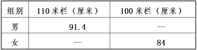 (5)跨栏采用的栏架高度和投掷项目所使用的器材重量,均按照以下标准(表1-1和表1-2)。