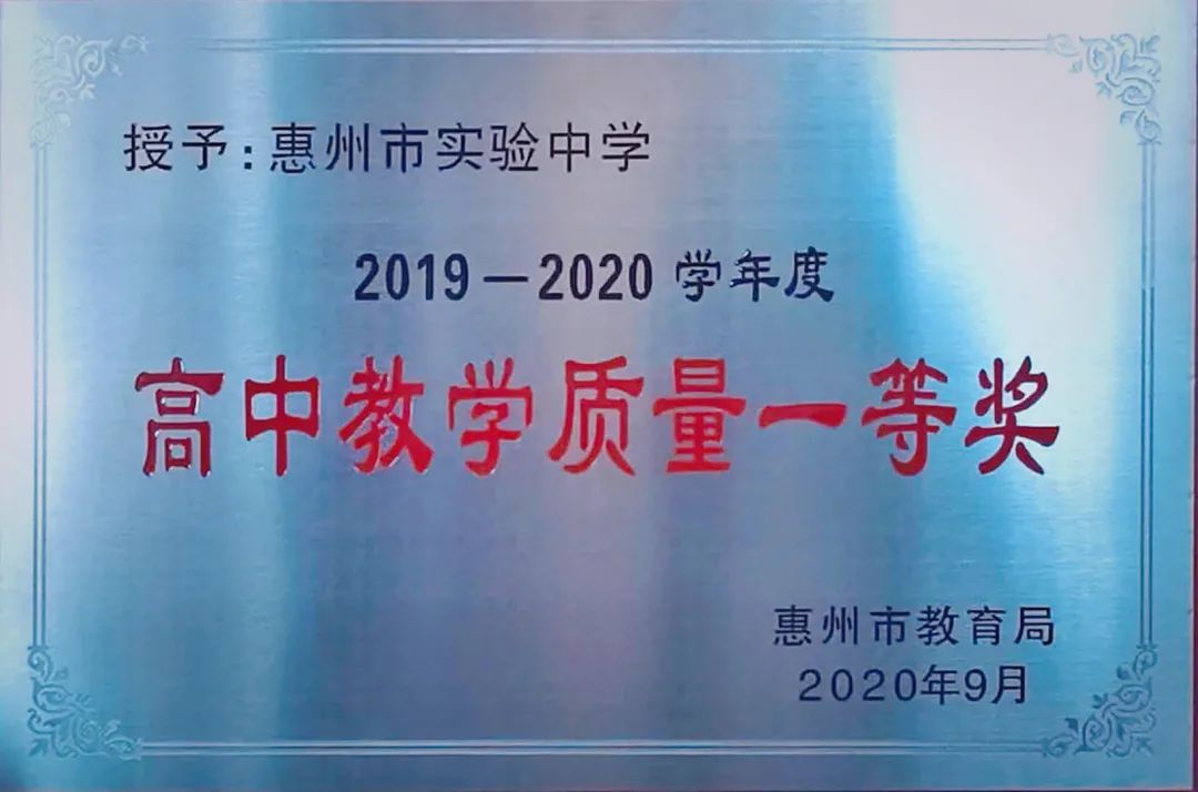 因成绩突出,我校连年荣获惠州市“高中教学质量一等奖”,在2020高中教学质量评比中,我校除获得惠州市“教学质量一等奖”之外,英语备课组、高三(15)班教师团队还分获市“优秀备课组团队”、“优秀班级团队”两项大奖(全市同时获得三项高考备考大奖的仅四所学校)。这些成绩彰显了我校先进的人才培养模式与卓越的办学实力,进一步擦亮了学校品牌,得到了社会各界的高度肯定,提升了学校的社会美誉度。