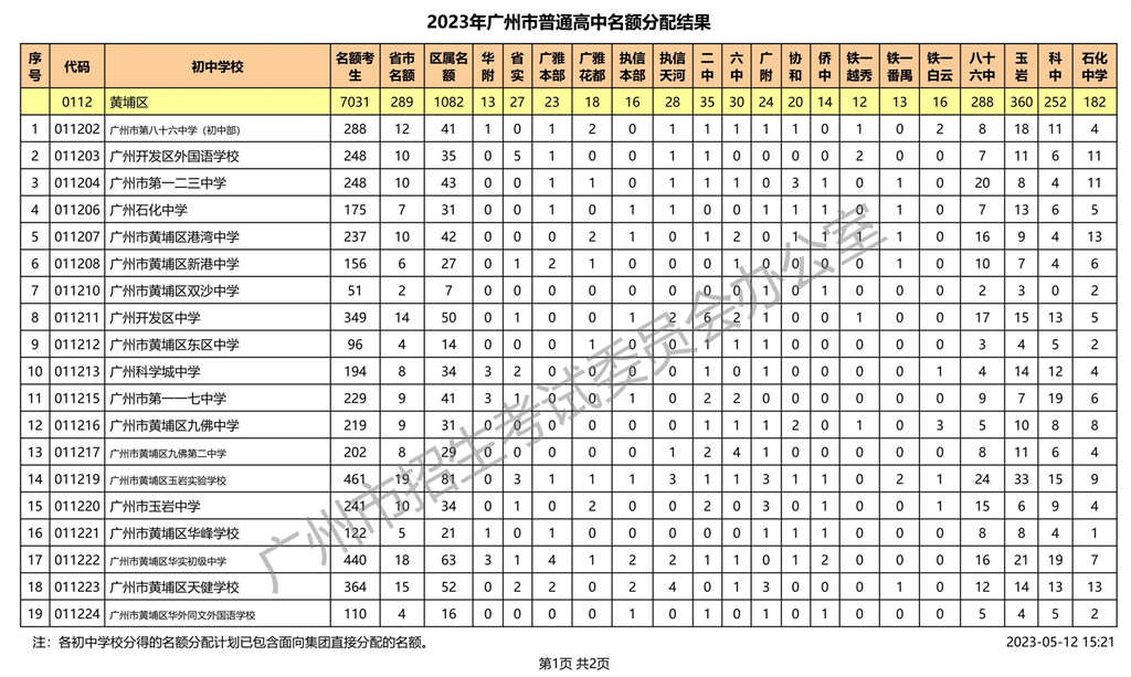 黄埔区|2023年广州市普通高中名额分配结果