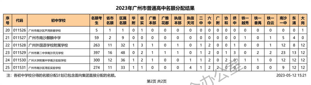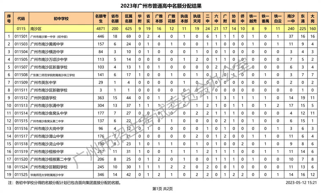 南沙区|2023年广州市普通高中名额分配结果