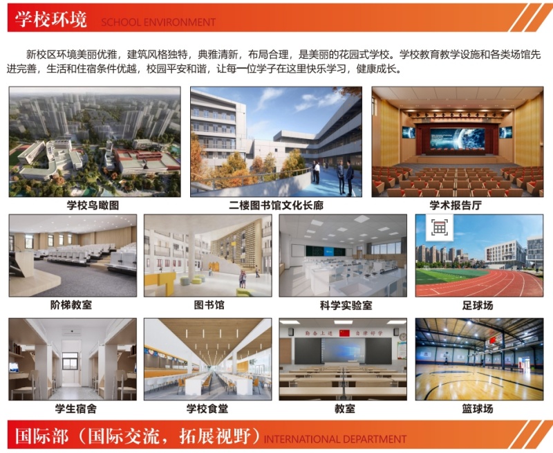 校园总建筑面积31000平方米,包括国际水准的标准教室、图书馆、各类实验室、室内体育馆、室外运动场、学生公寓、师生餐厅、智能化报告厅、艺术工作室、舞蹈厅、教师及专家公寓等基础硬件设施。新校区以“面向国际化、未来化,高起点、高标准、高品位”为目标,各类高科技设备做到学校物理空间与网络空间有机结合,智能化、信息化、网络化、人性化等现代化学校特征体现在校园的每一个角落,为师生提供一流的工作和学习环境。