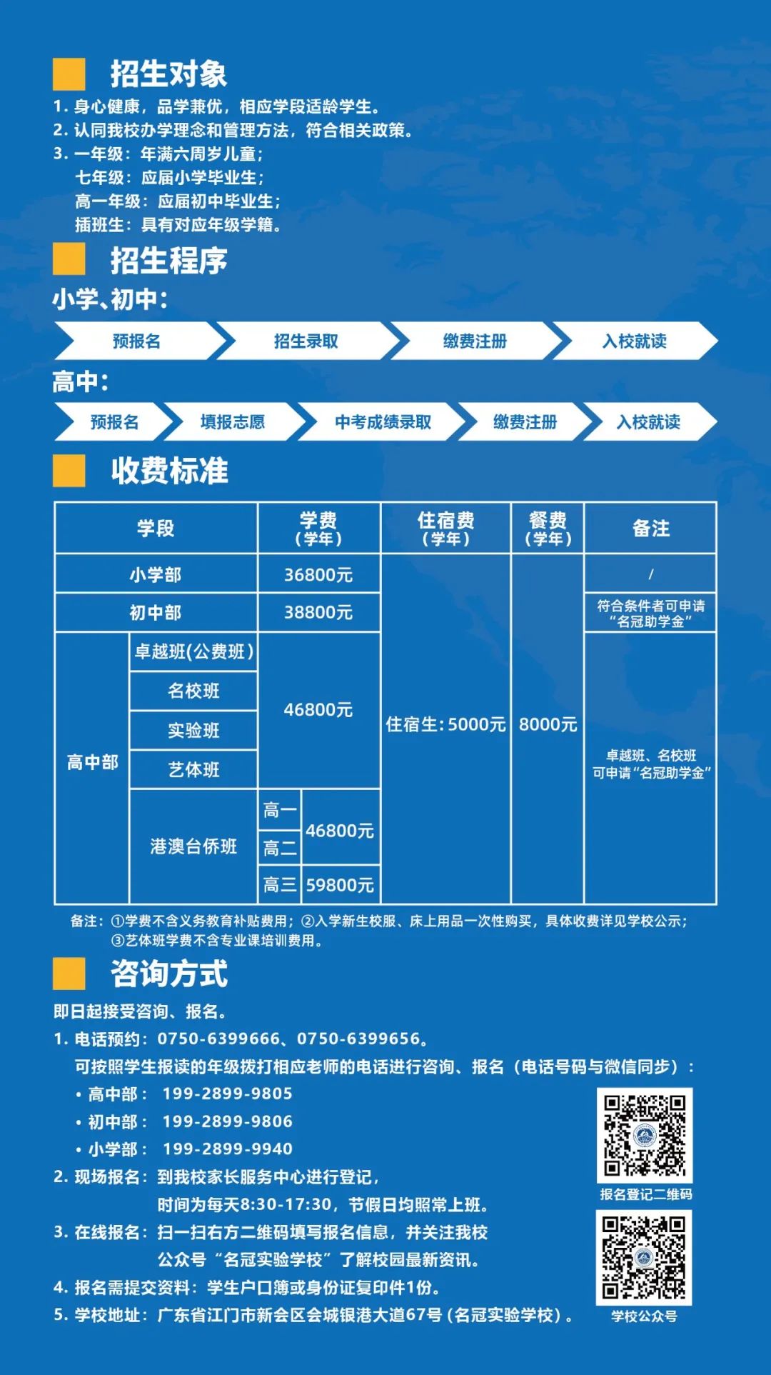 插班生意向登记 01 招生对象 小学:2025年秋季二至六年级学生 初中:2025年秋季初二至初三年级学生 高中:2025年秋季高二至高三年级学生 02 招生时间 即日起至8月底,额满即止。 03 扫码登记 扫下方二维码登记或拨打咨询热线报名,校方将安排招生老师与您联系。 04 学校地址 广东省江门市新会区会城银港大道67号