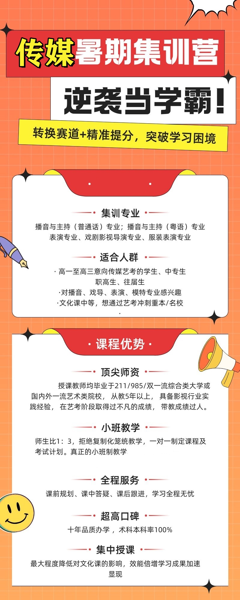 为了充分应对广东省传媒类播音与主持、戏剧影视导演、影视表演方向艺术类统考及艺术类校考,面临即将到来的暑期集训活动。我们真诚期待每位考生都能全身心投入专业学习,同时也希望家长们为考生们提供强力的精神鼓舞,以帮助他们以最佳表现和自信心态迎接挑战。