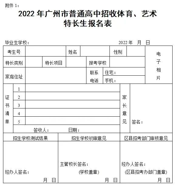 附件1:2022年广州市普通高中招收体育、艺术特长生报名表