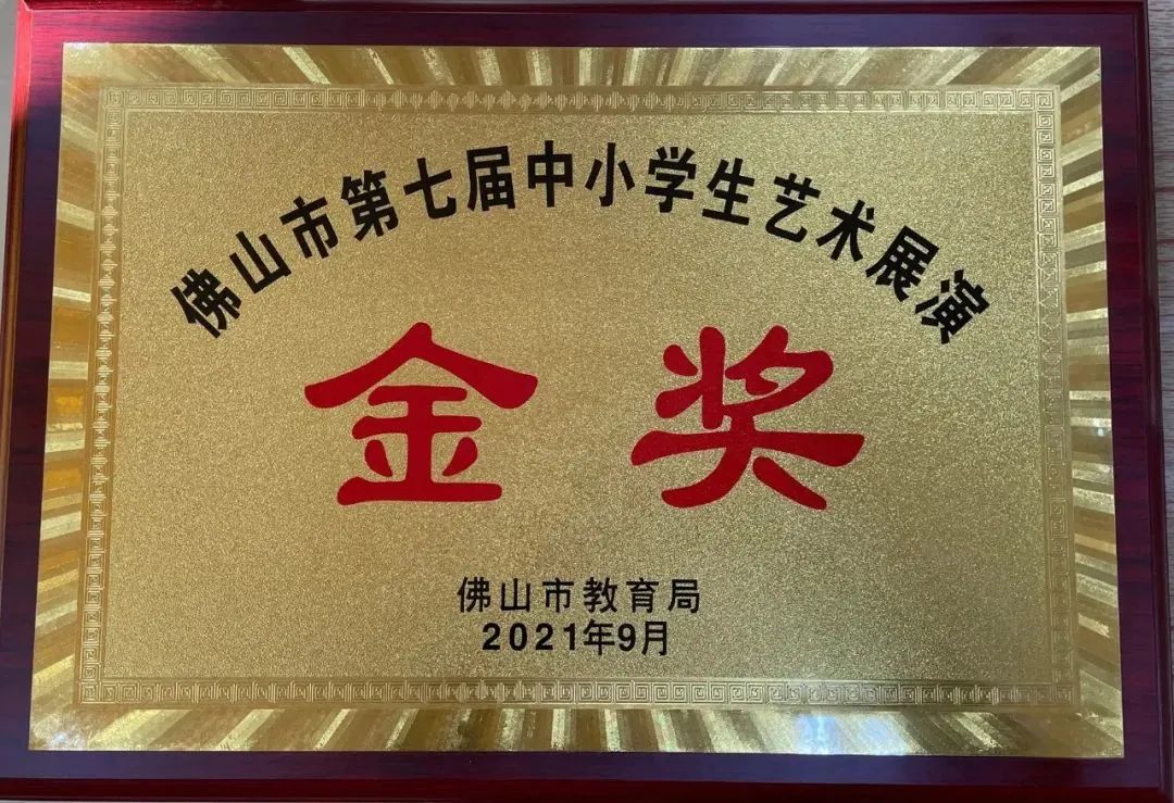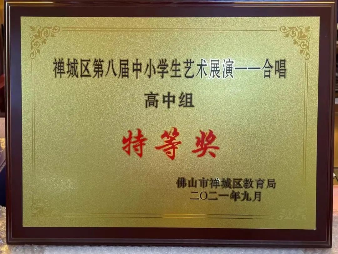 校合唱团展演《我喜欢》和《没有共产党就没有新中国》两首曲目荣获佛山市第七届中小学生艺术展演金奖、禅城区第八届中小学生艺术展演高中组特等奖。