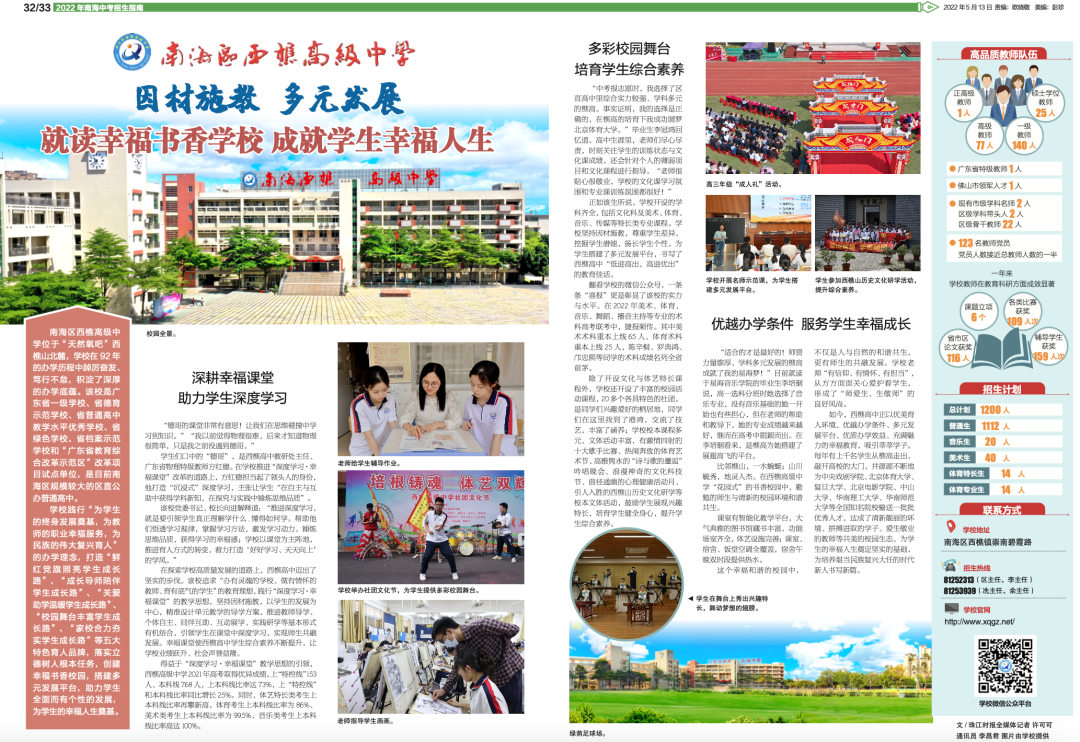 在探索学校高质量发展的道路上,西樵高中迈出了坚实的步伐。该校追求“办有灵魂的学校、做有情怀的教师、育有底气的学生”的教育理想,践行“深度学习·幸福课堂”的教学思想,坚持因材施教,以学生的发展为中心,精准设计单元教学的导学方案,推进教师导学、个体自主、同伴互助、互动展学、实践研学等基本形式有机结合,引领学生在课堂中深度学习,实现师生共融发展。幸福课堂使西樵高中学生综合素养不断提升,让学校业绩跃升、社会声誉益隆。