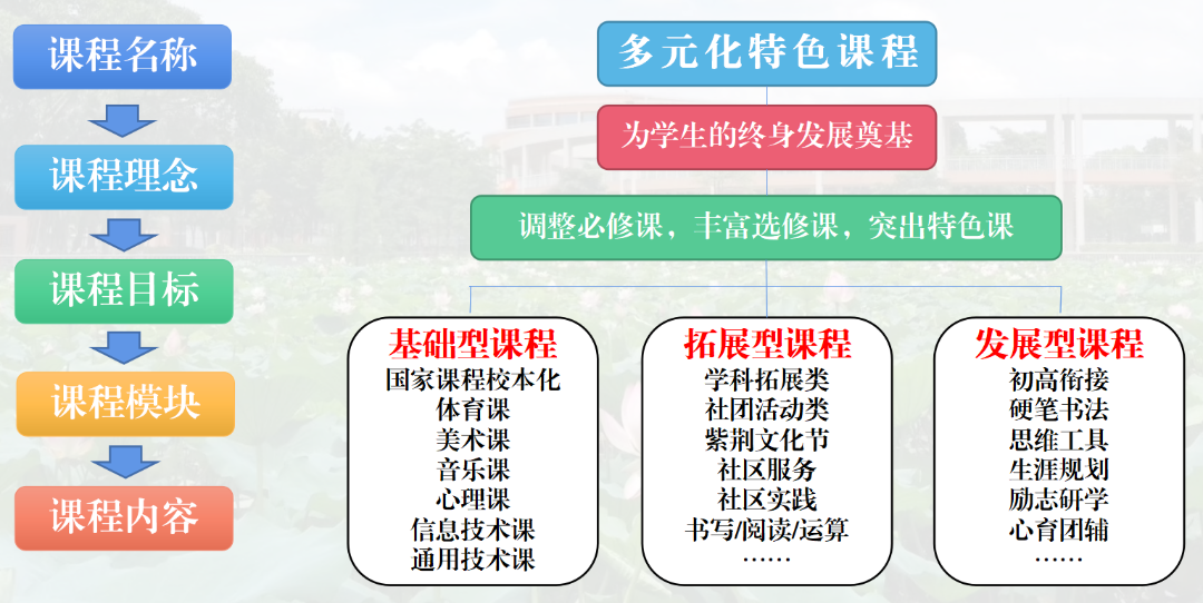 遵循学生课程选择的多样性、层次性、综合性、发展性原则,我校将国家课程校本化,校本课程体系化,积极创设勒中特色课程——即基础型课程、拓展型课程以及发展型课程。