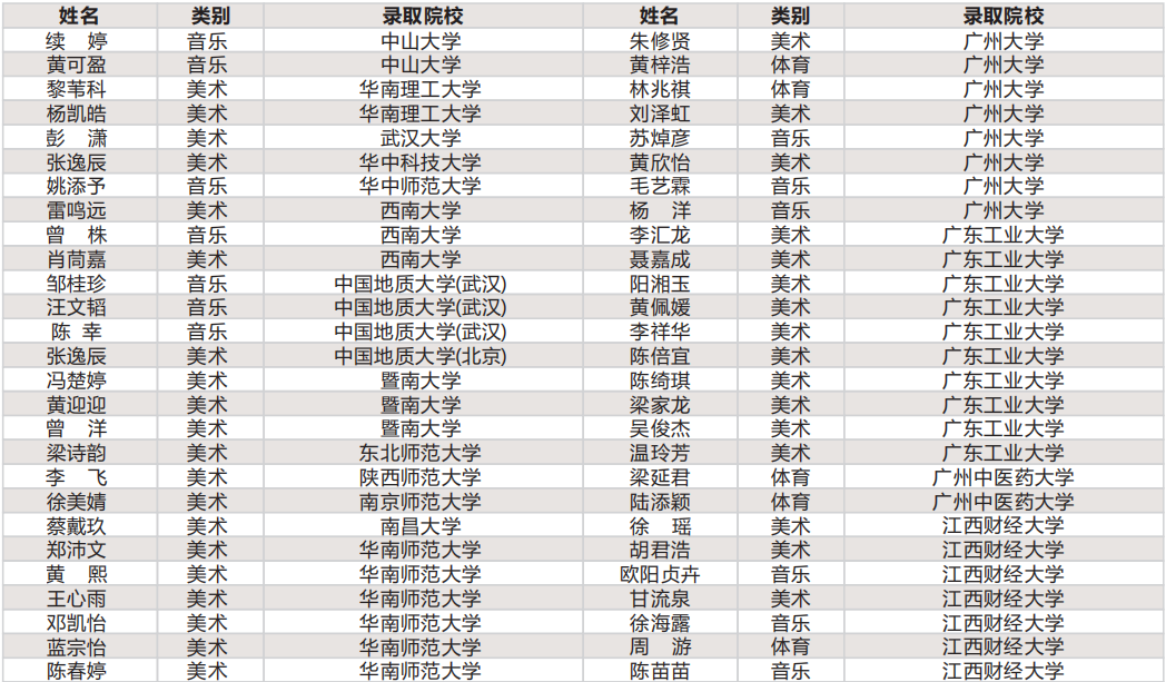 作为全区最早开设艺术教学的学校之一,我校艺术教学已经形成了规模和品牌。目前初中和高中都开设有美术(陶艺)、音乐、体育特色教学班,高中还开设有传媒特色教学课程。近四年广东高考术科联考,我校艺术类重点本科和本科上线人数位居区前两位。