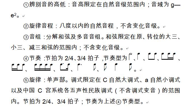 (1)考试目的。通过对音乐听觉能力、音乐记忆力的测试,鉴定考生是否具备学习音乐的必备条件。