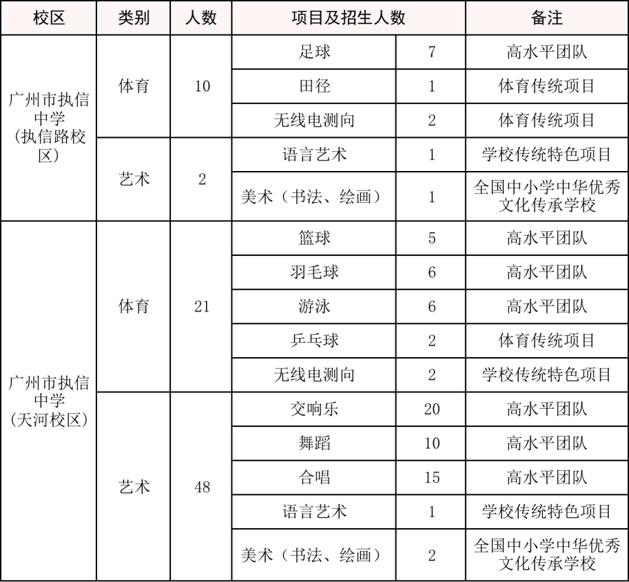 (八)填报志愿与录取办法。填报志愿时,经审核具备广州市执信中学(天河校区或执信路校区)体育、艺术特长生资格的考生须在第一批次的特长生志愿栏目填报广州市执信中学(天河校区或执信路校区)。参加广州市初中升学统一学业文化考试后,按有关协议和上级的规定录取。