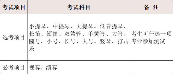 (1)弦乐、管乐考生:自选音阶一条(弦乐三个八度,管乐两个八度)、练习曲一首、乐曲一首。